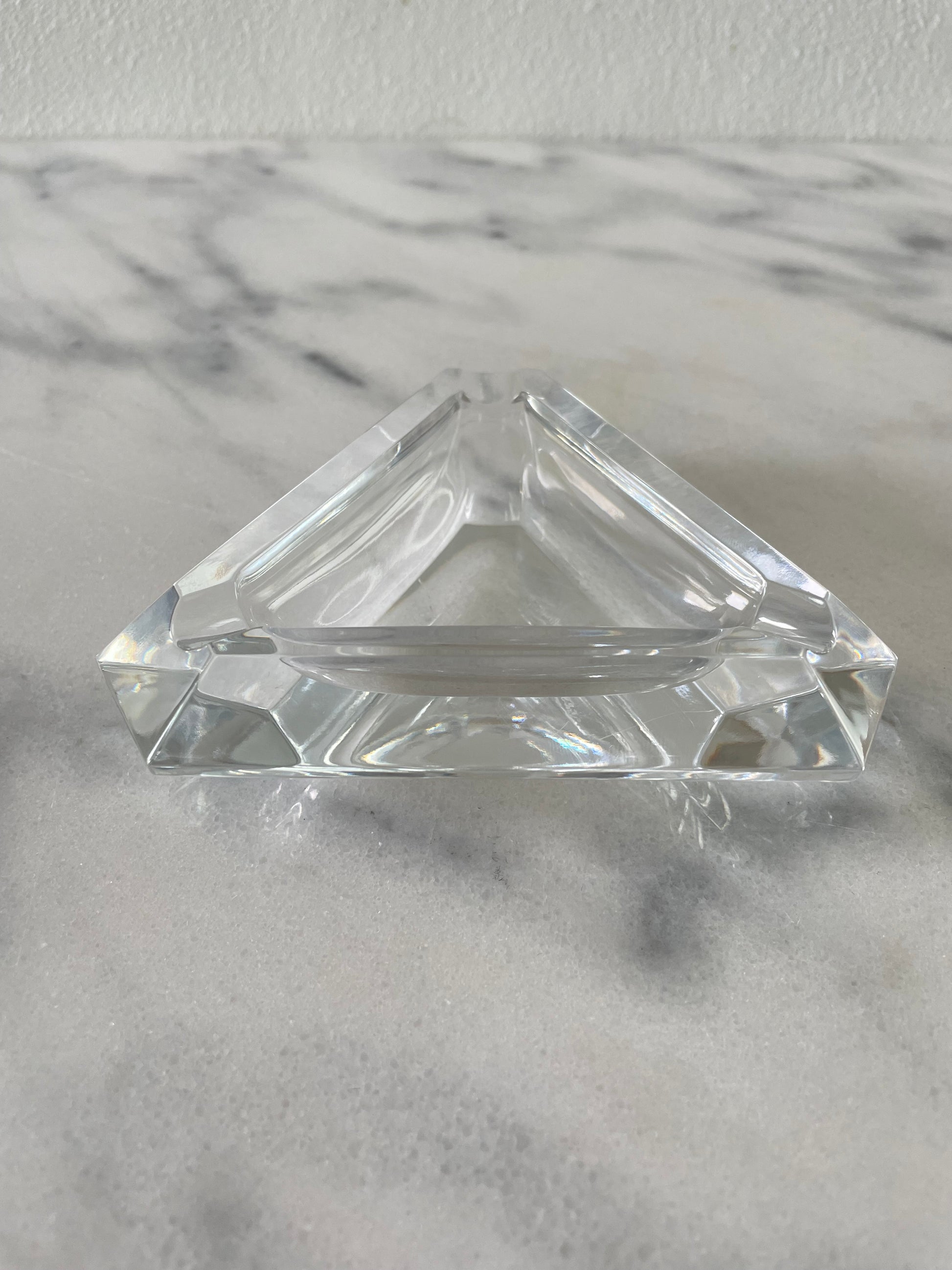This is a beautiful quality ashtray made by Belgian glass maker Val St. Lambert, known for quality crystal glass. It is made in a faceted triangular shape with cut corners. The bottom is signed Val St Lambert.