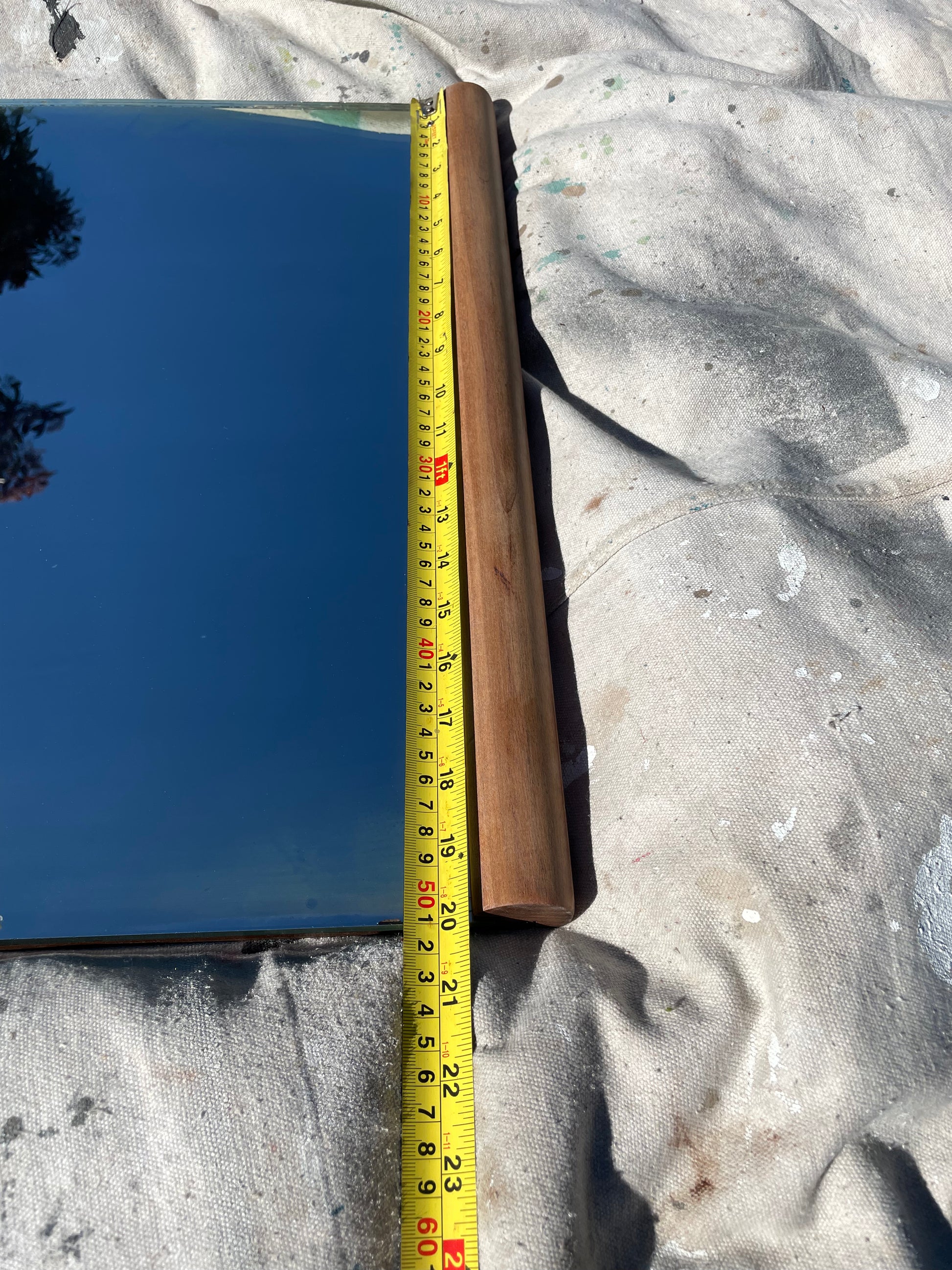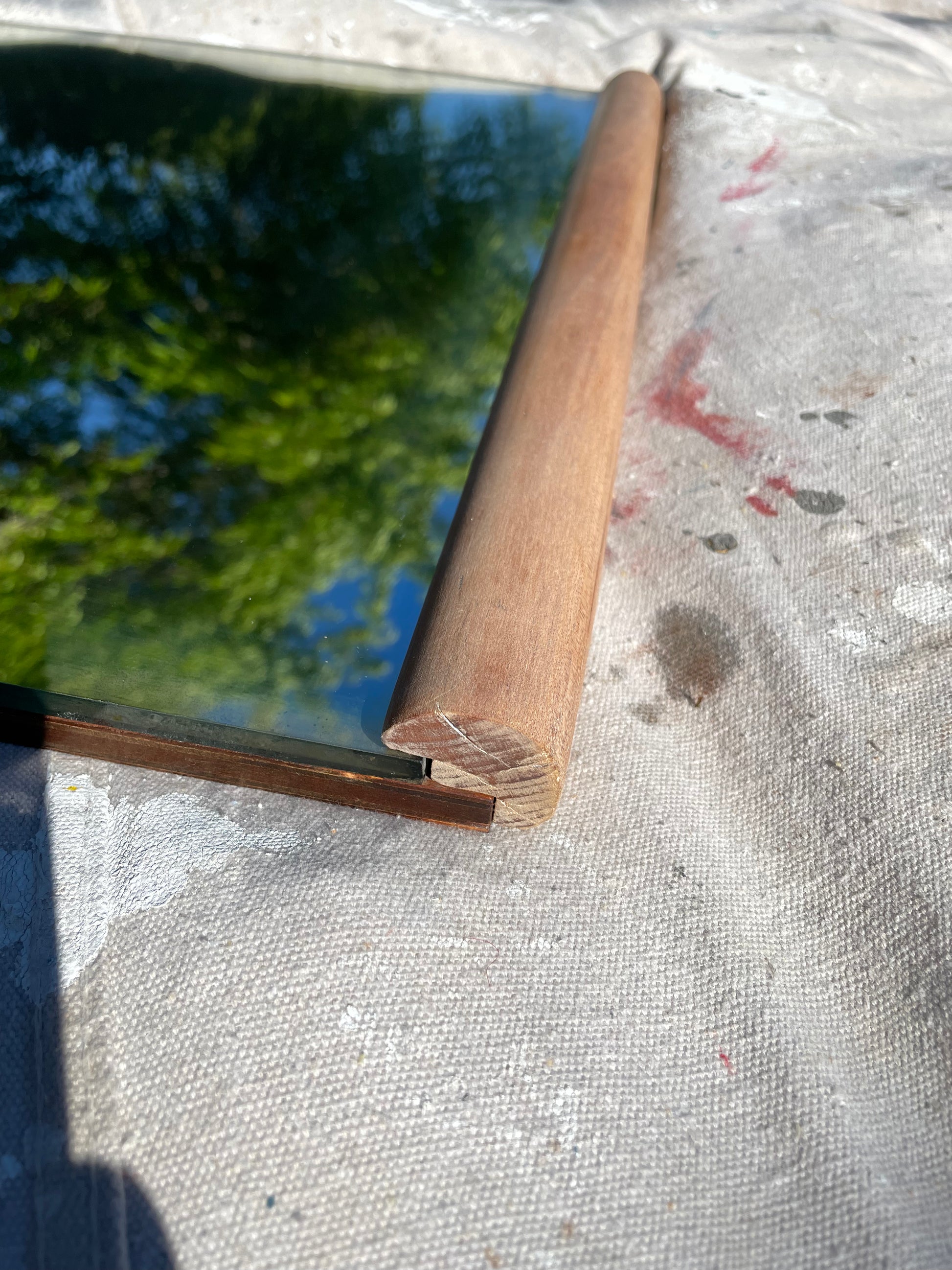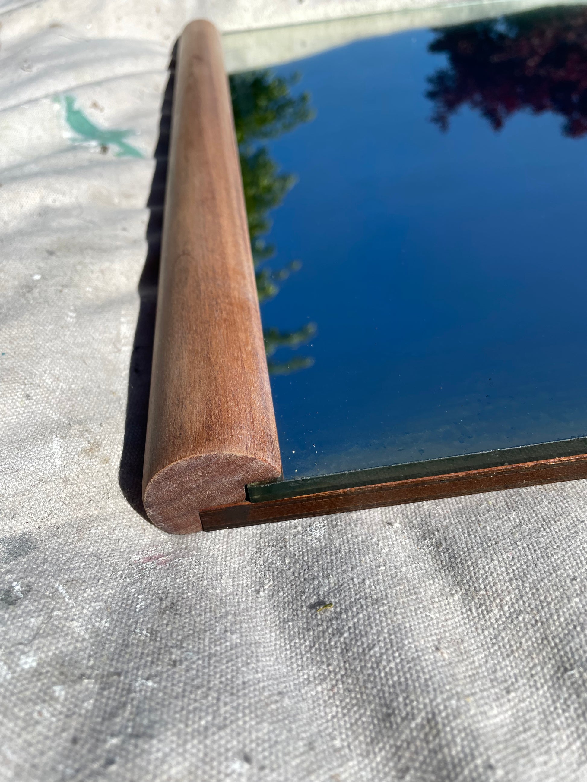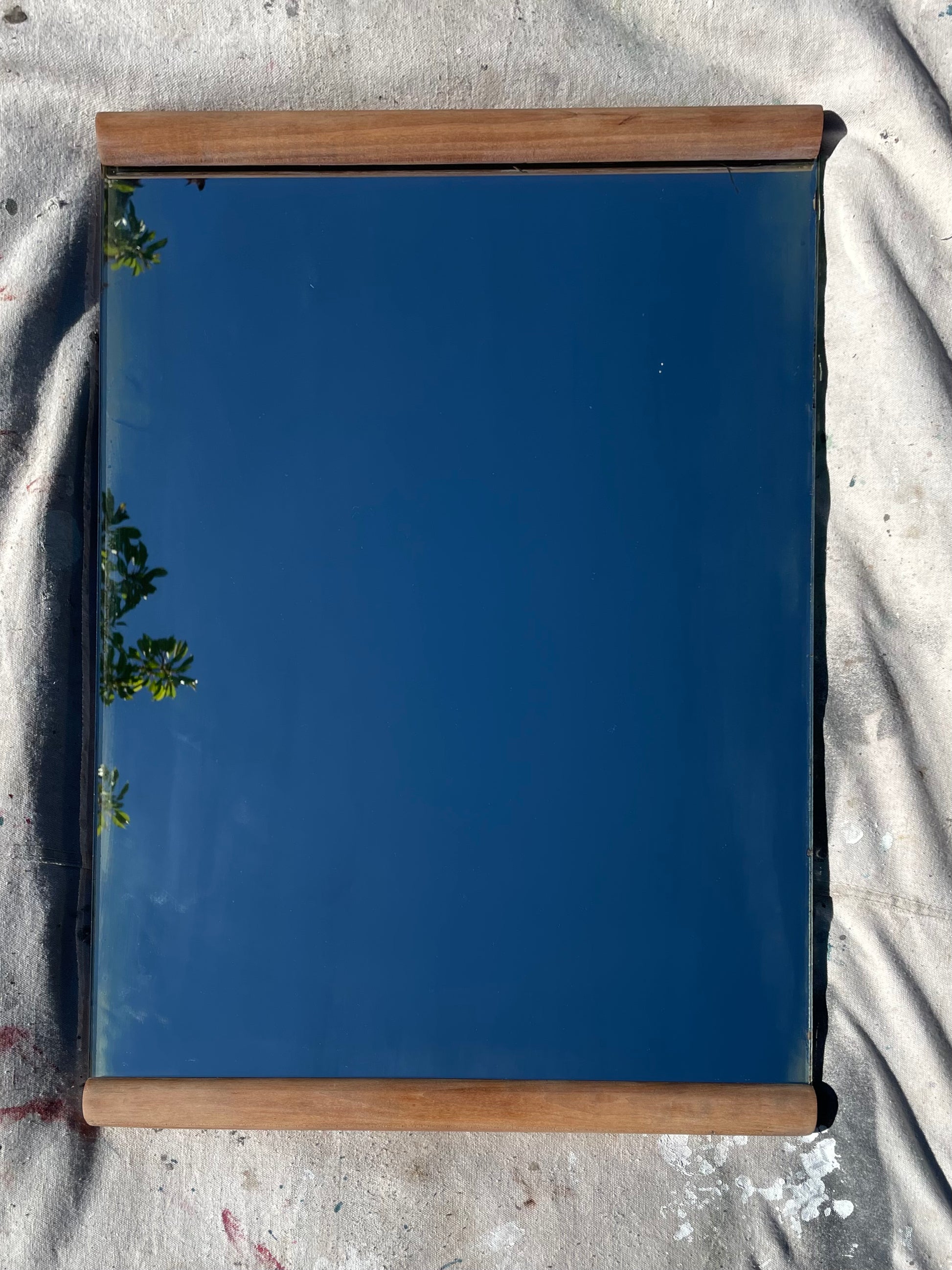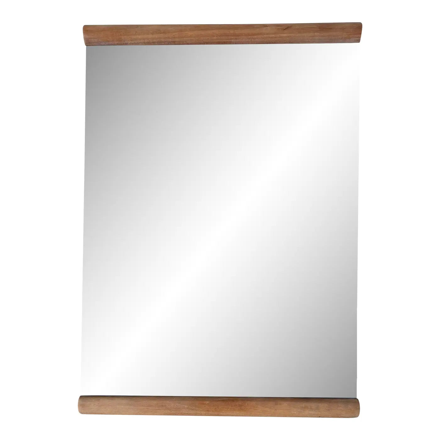 A vintage wall mirror with minimalist rounded cylindrical wood framing at the top and bottom. The wood frame is solid walnut with a subtle satin white oil stain. The mirror is thick and heavy, with a wood backing.