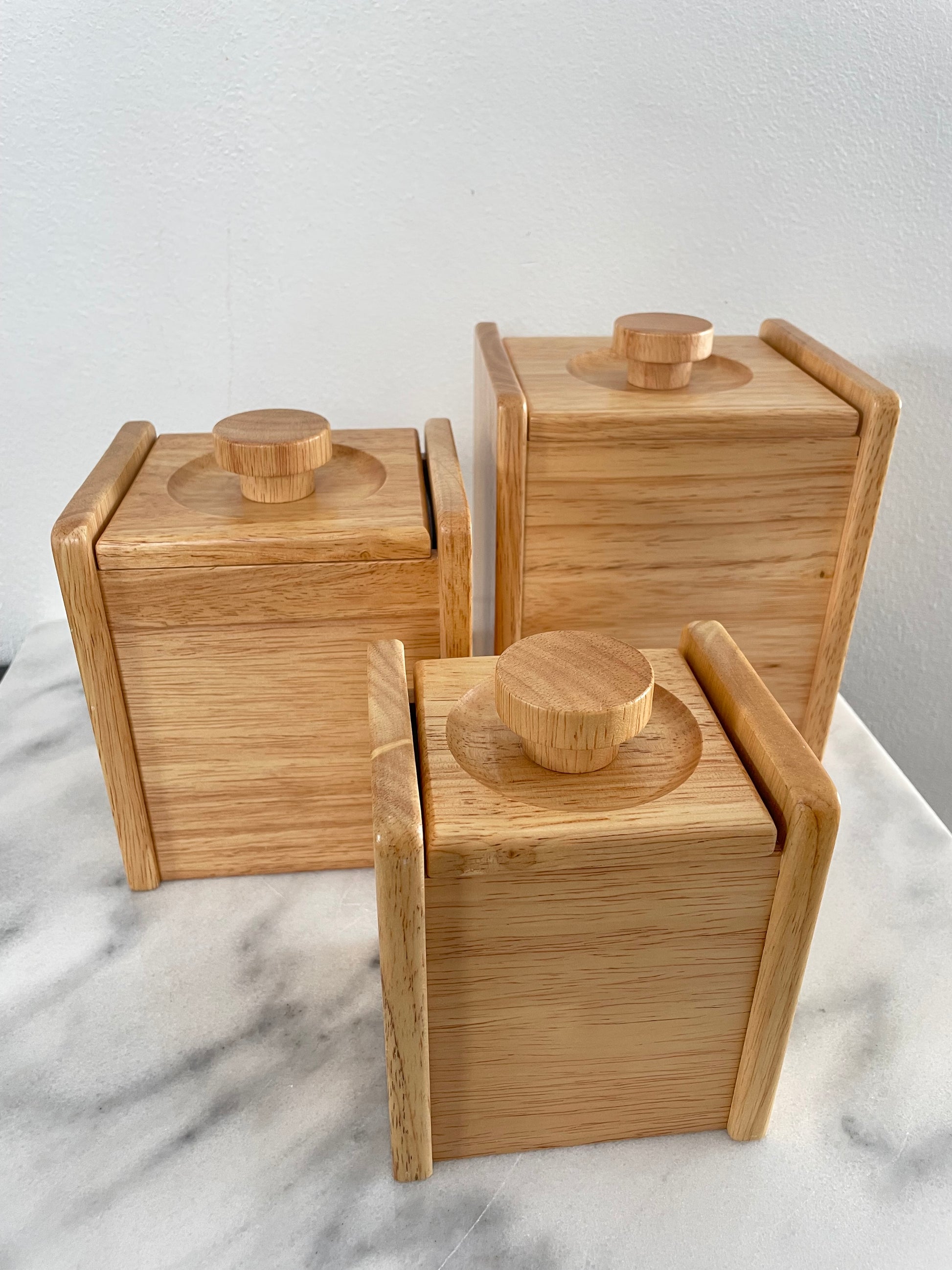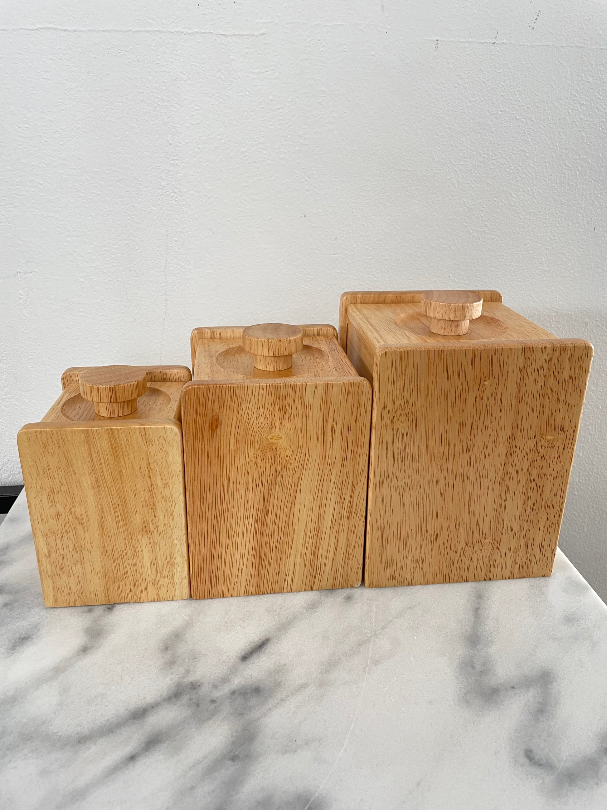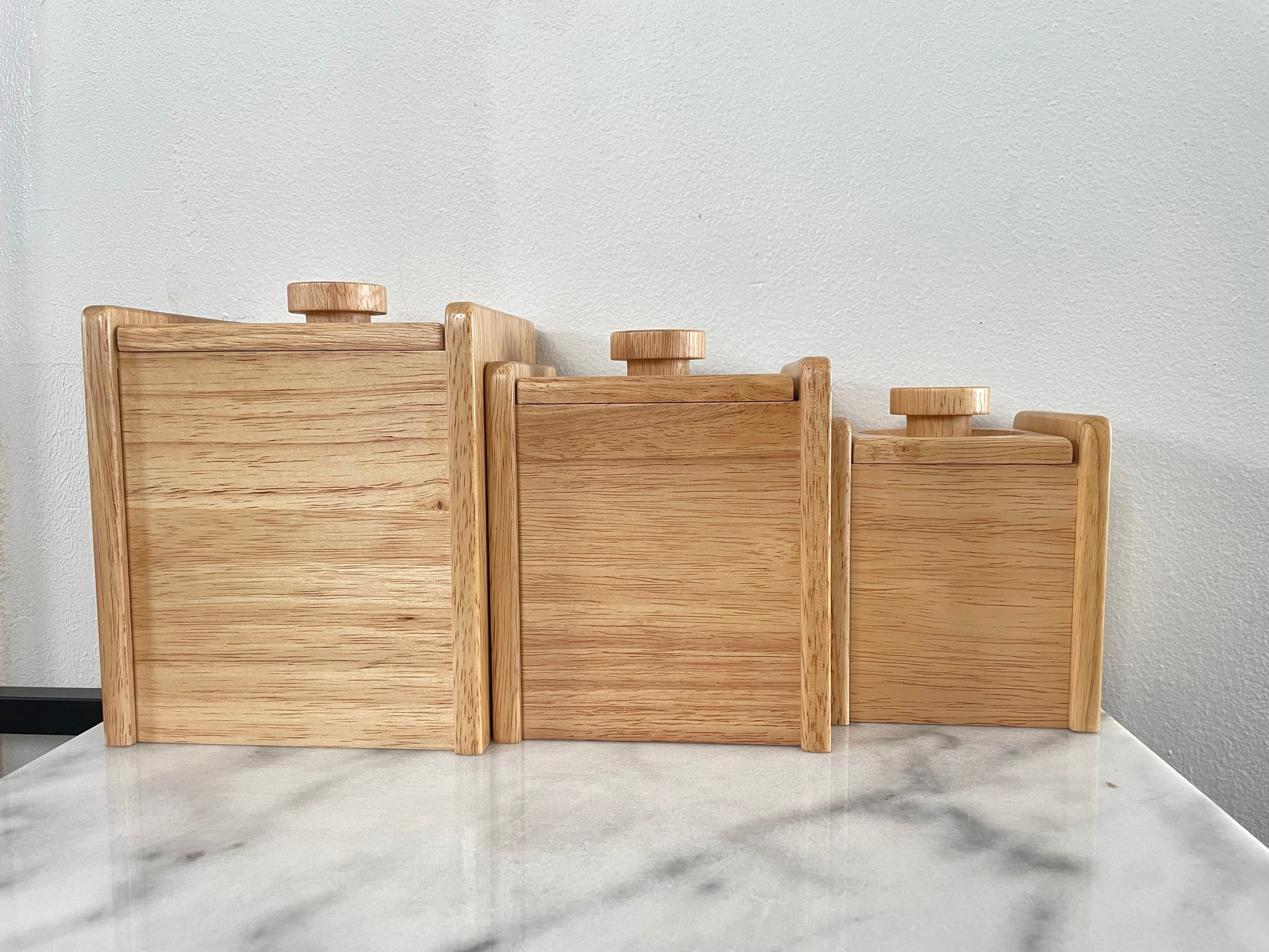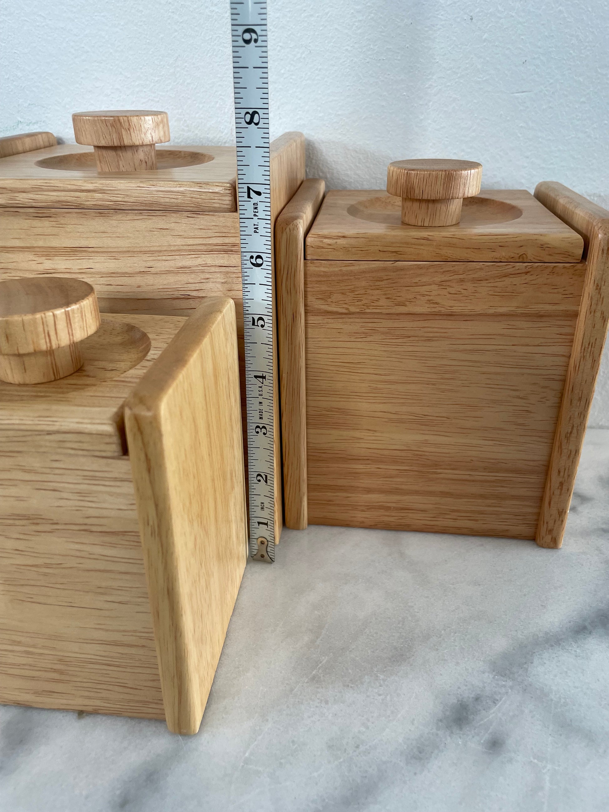 Gorgeous blonde wood canisters with internal plastic liners for easy cleaning. Solid hardwood made with elegant organic modern design. Air tight seals around lid. less