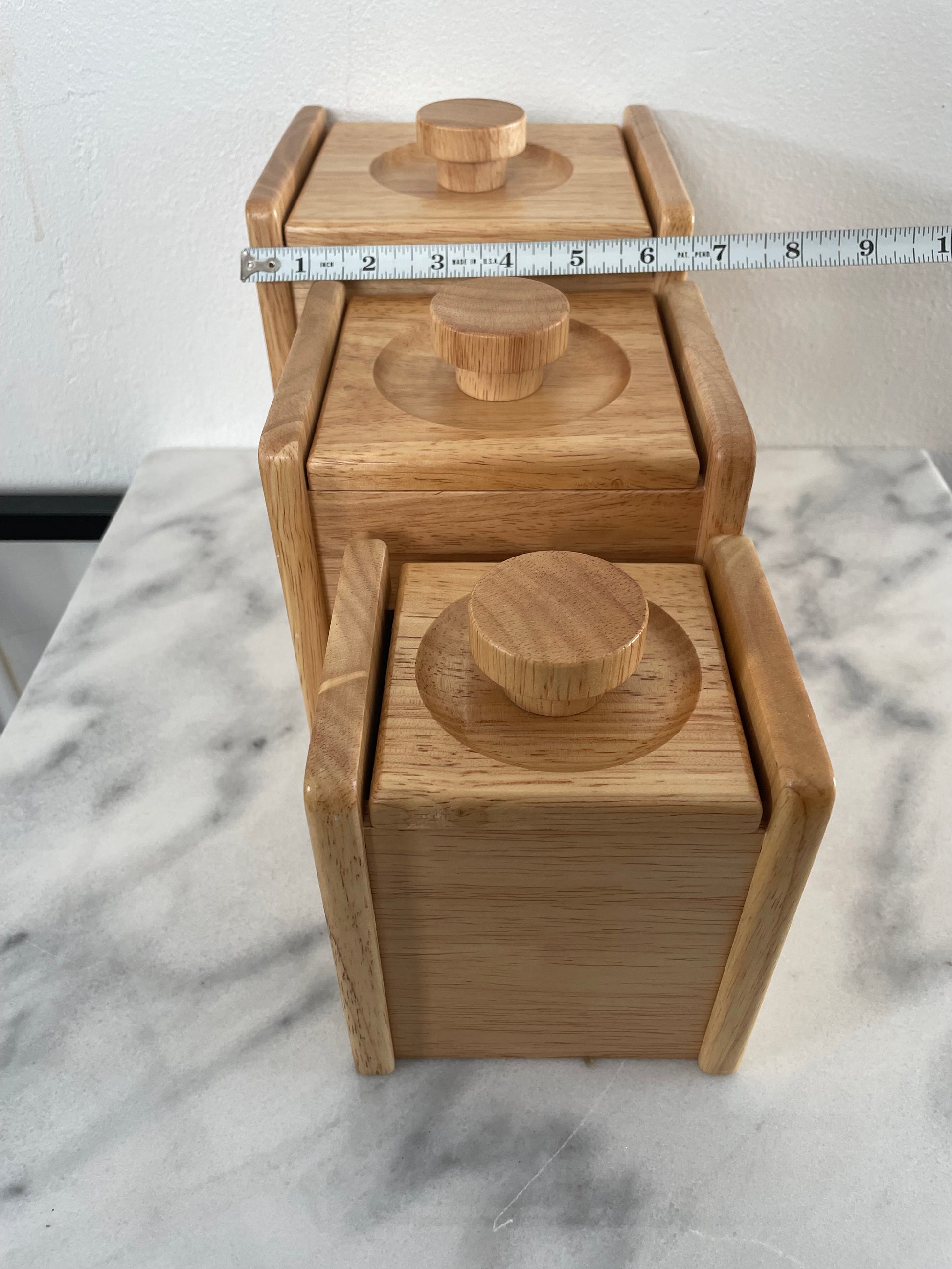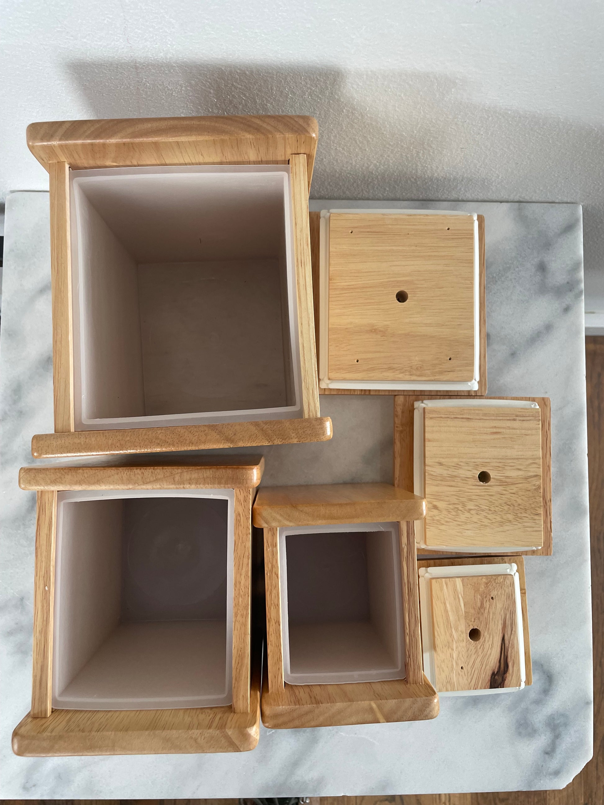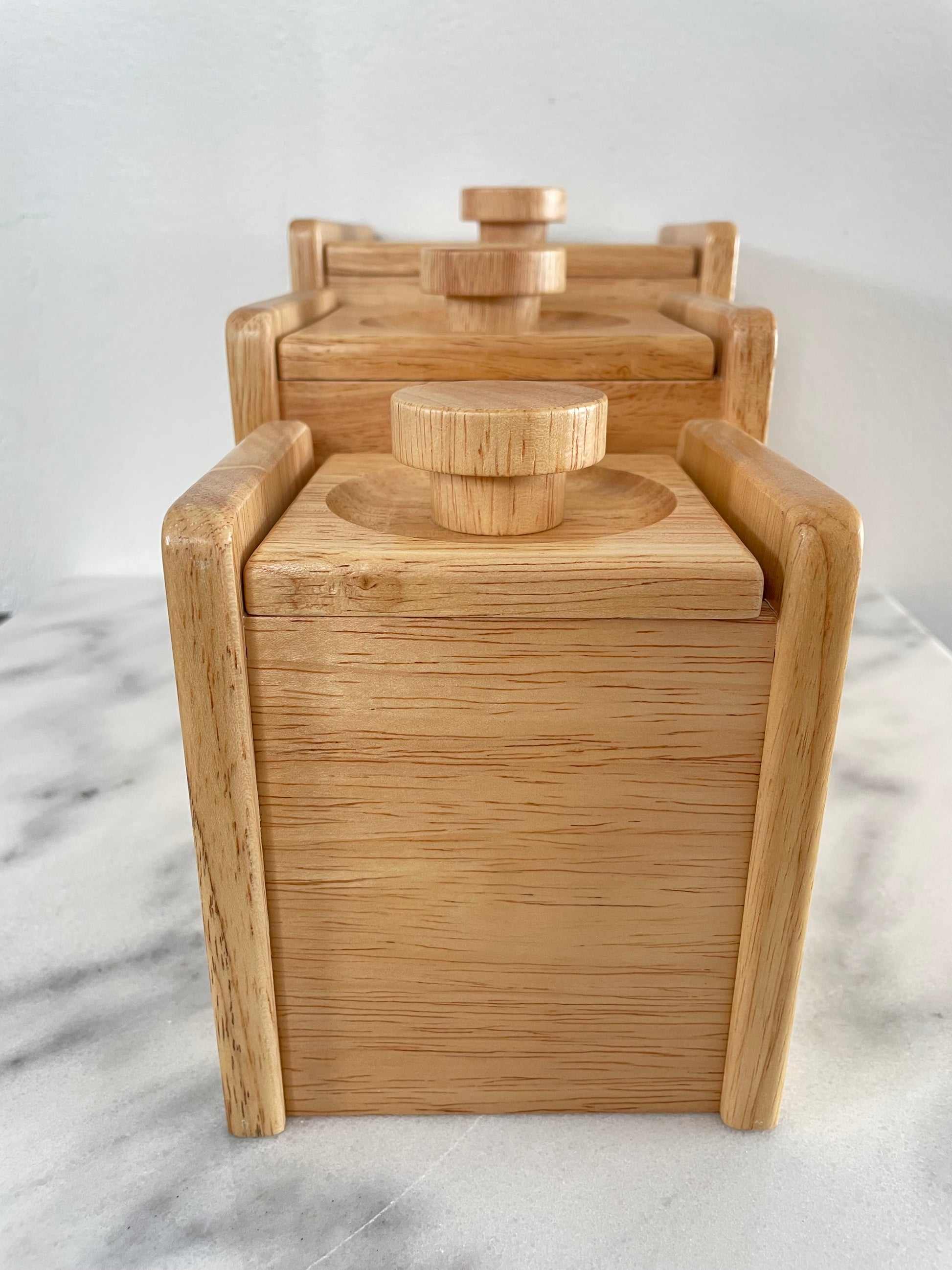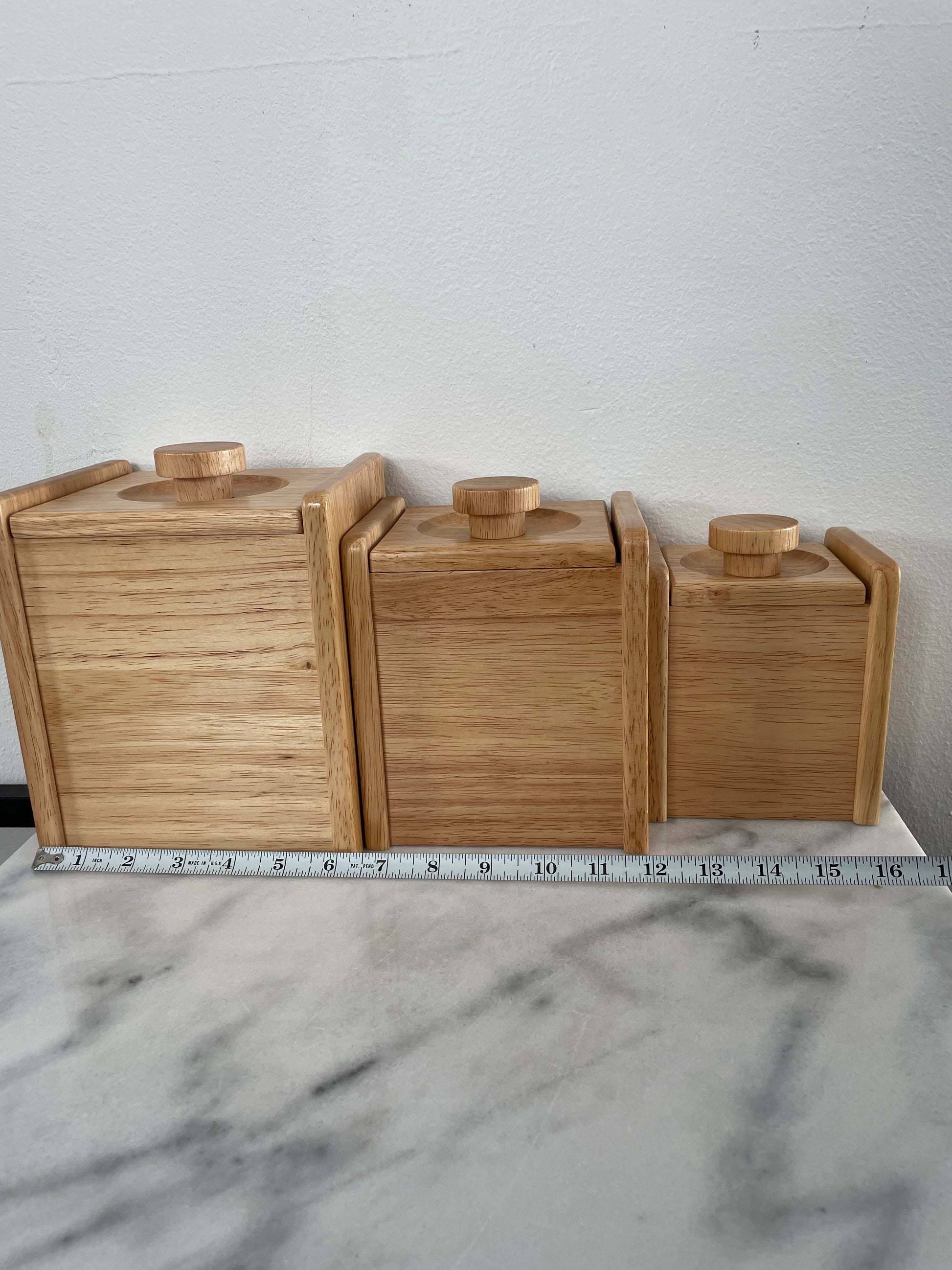 Gorgeous blonde wood canisters with internal plastic liners for easy cleaning. Solid hardwood made with elegant organic modern design. Air tight seals around lid. less
