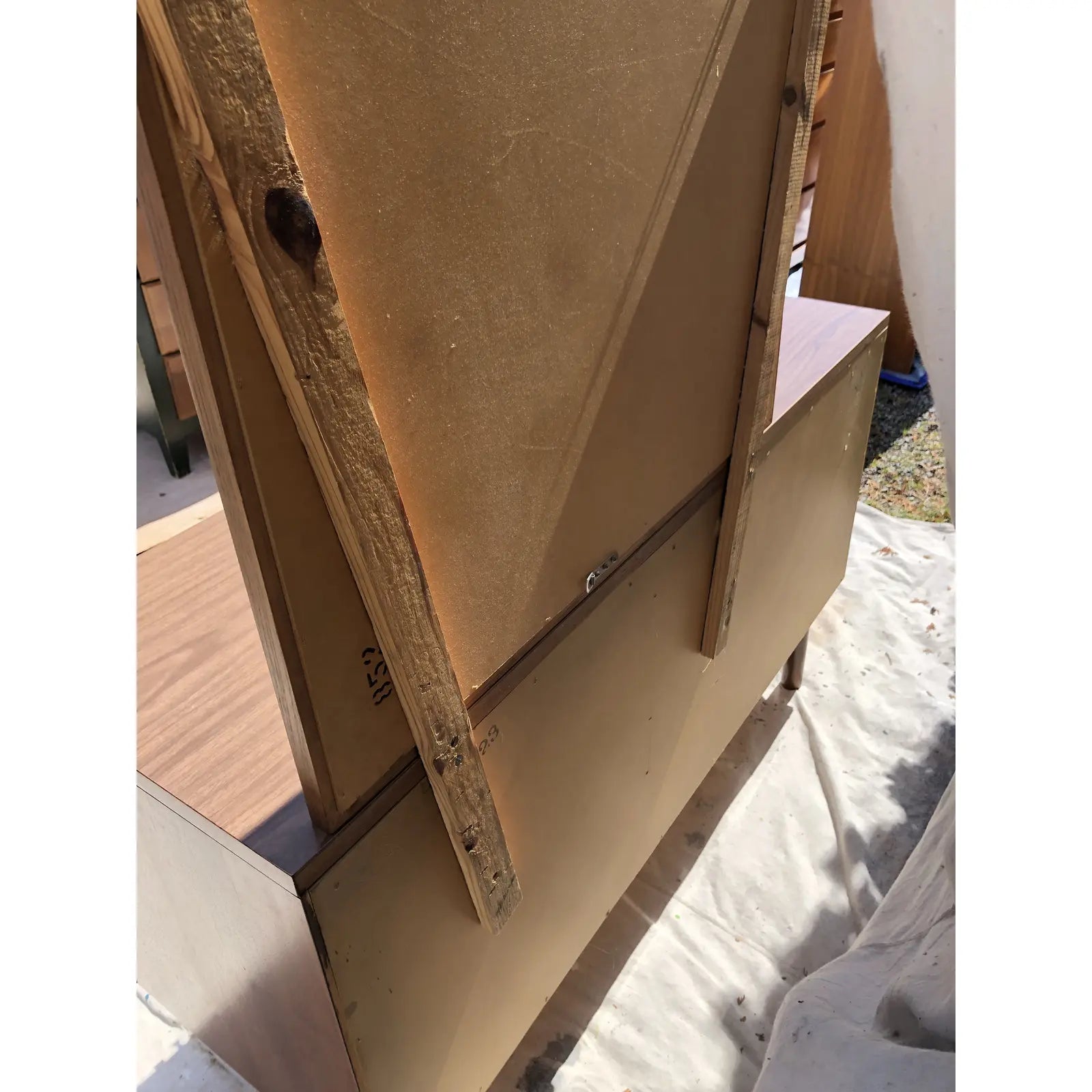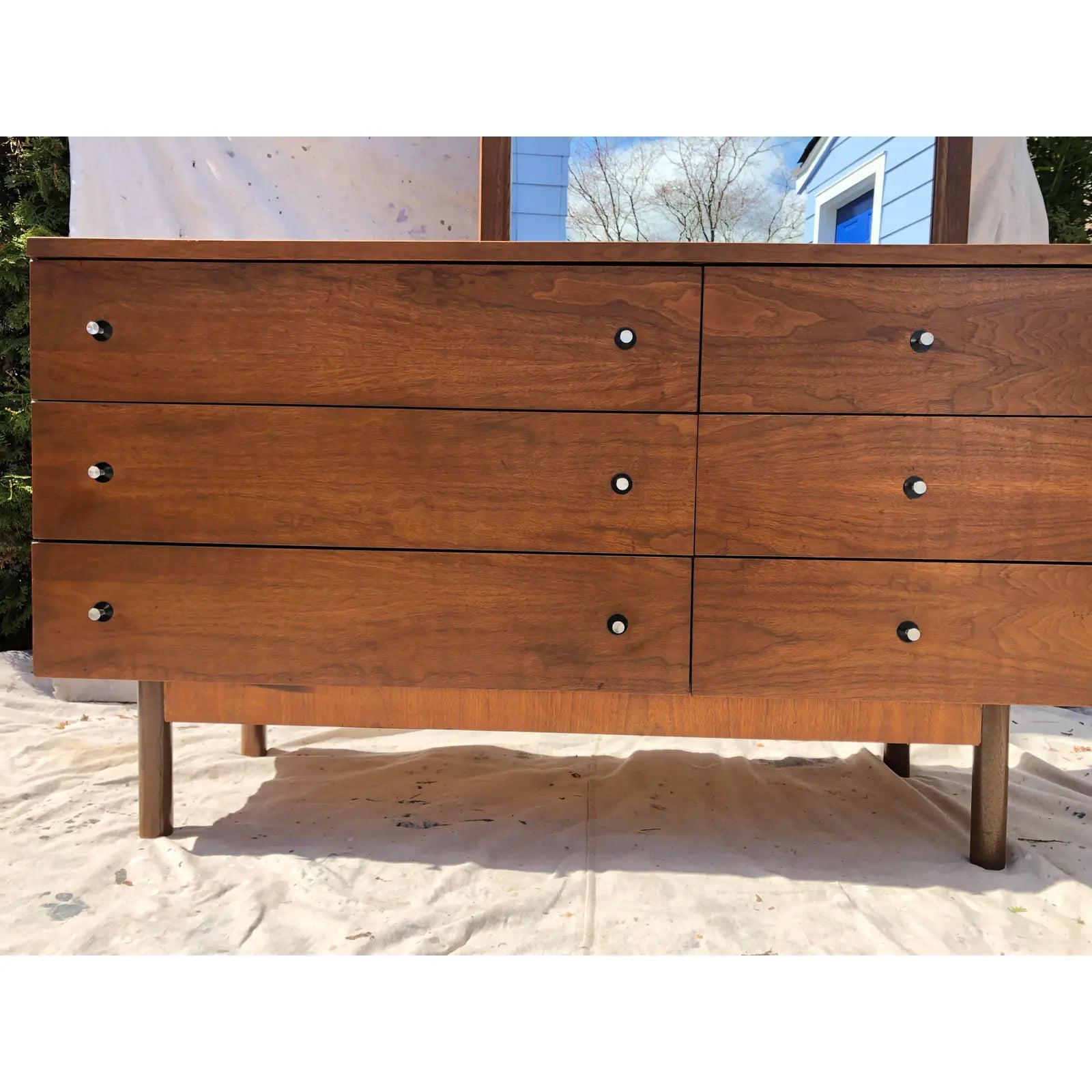 A mid century modern walnut long dresser with a scratch resistant formica top by Stanley Furniture. The mirror can be taken off or set anywhere along dresser. The wood is in near pristine condition. This is a beautiful example of American mid-century design from the 1960s era with its clean lines and stylish knobs.
