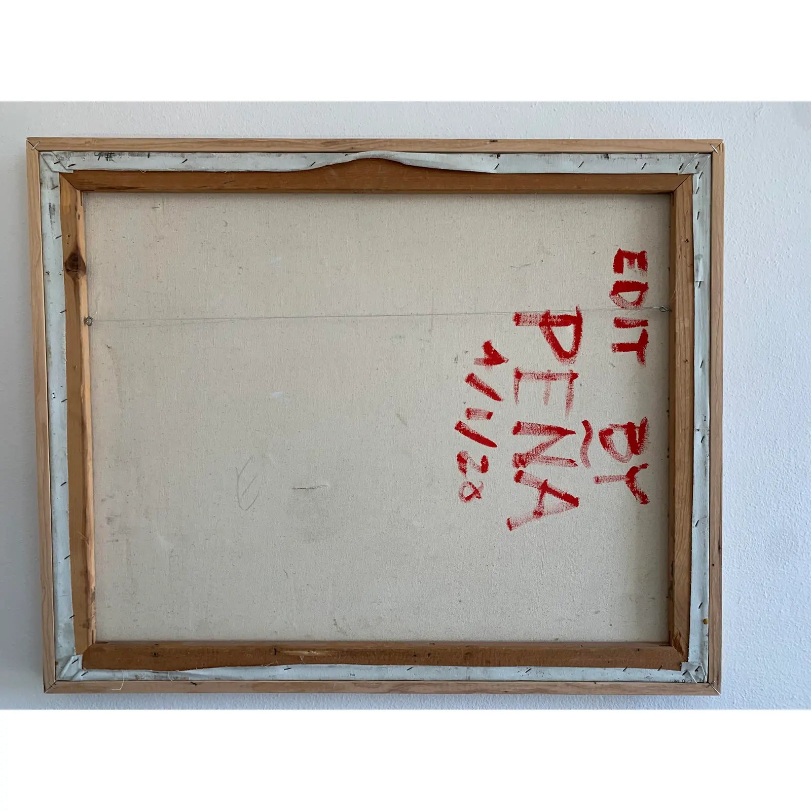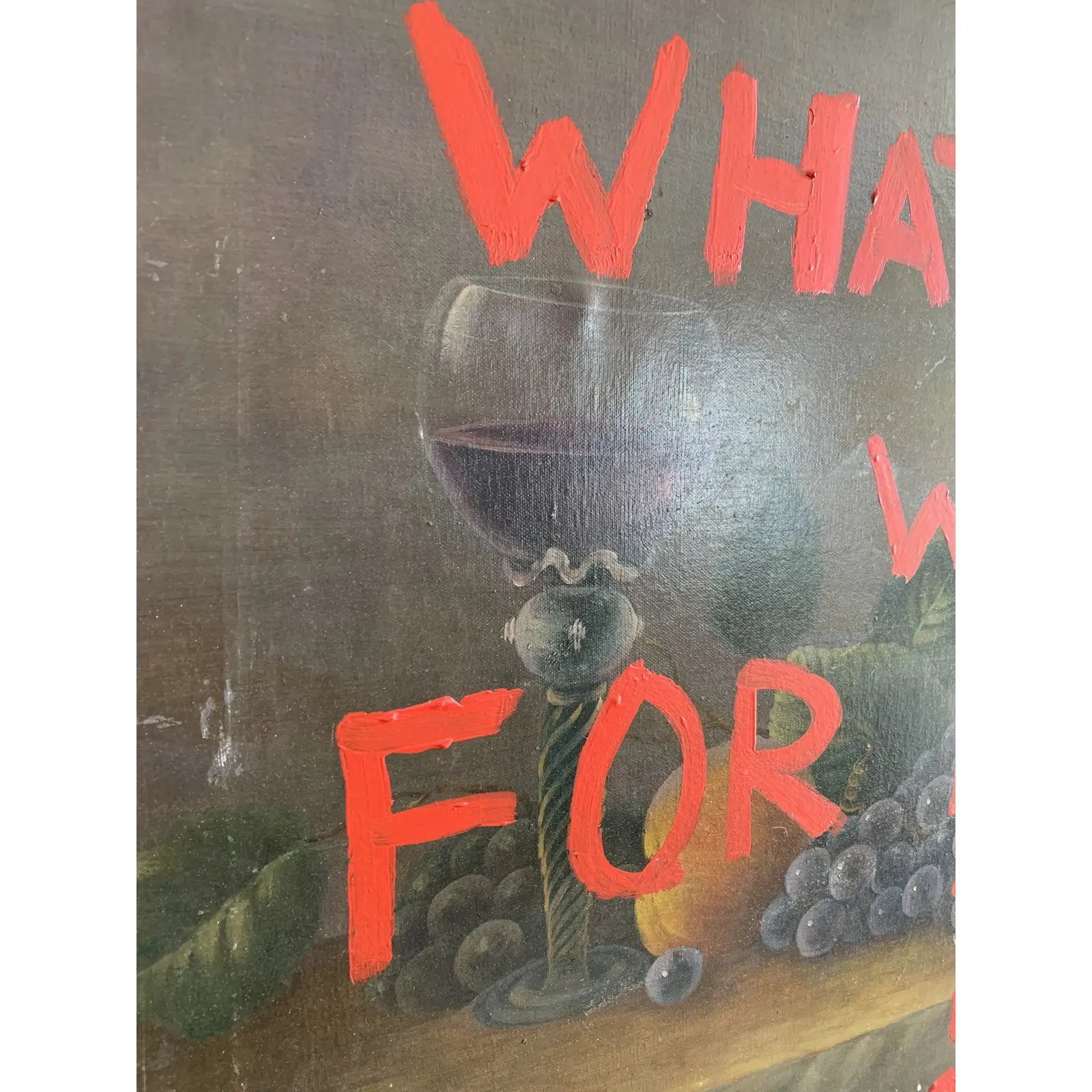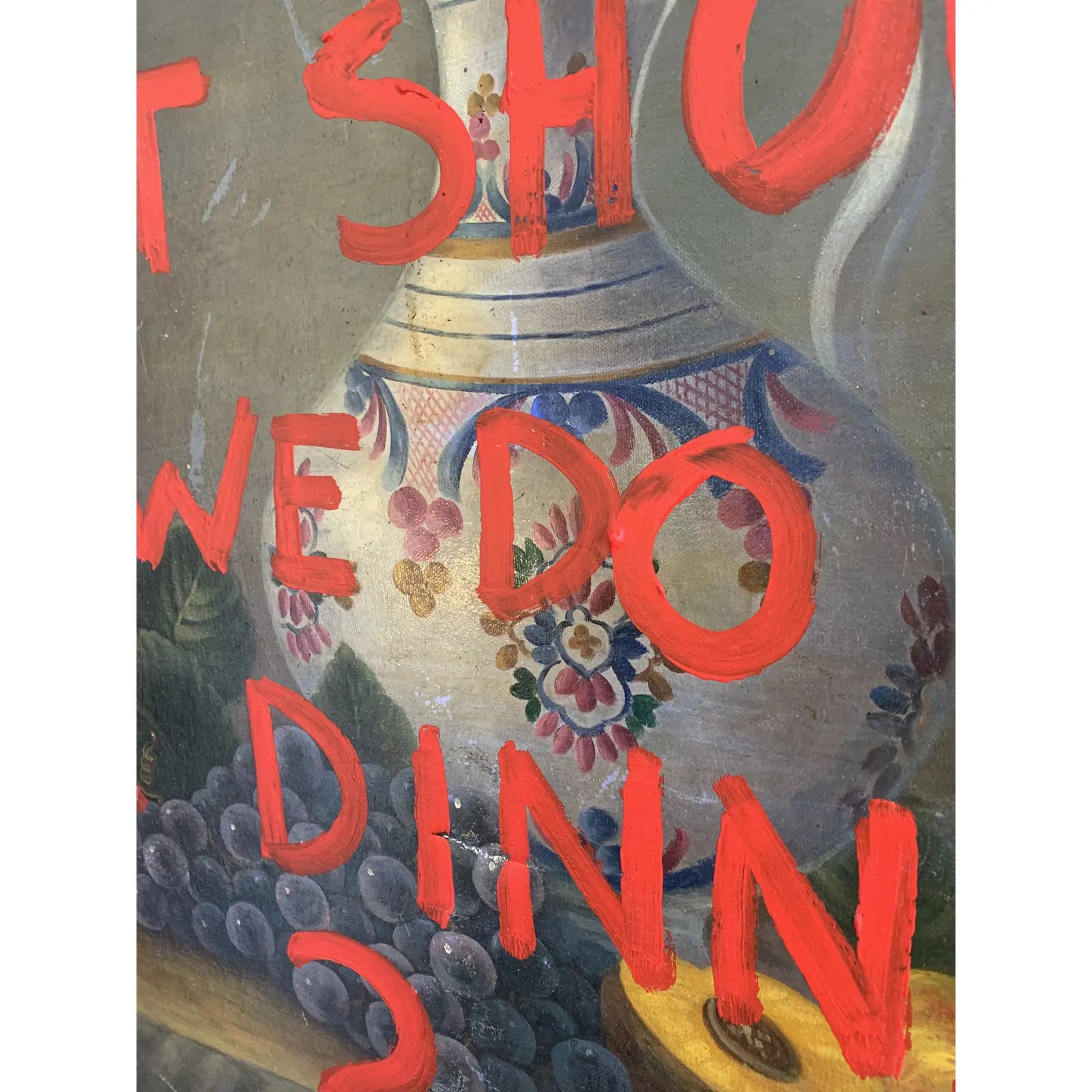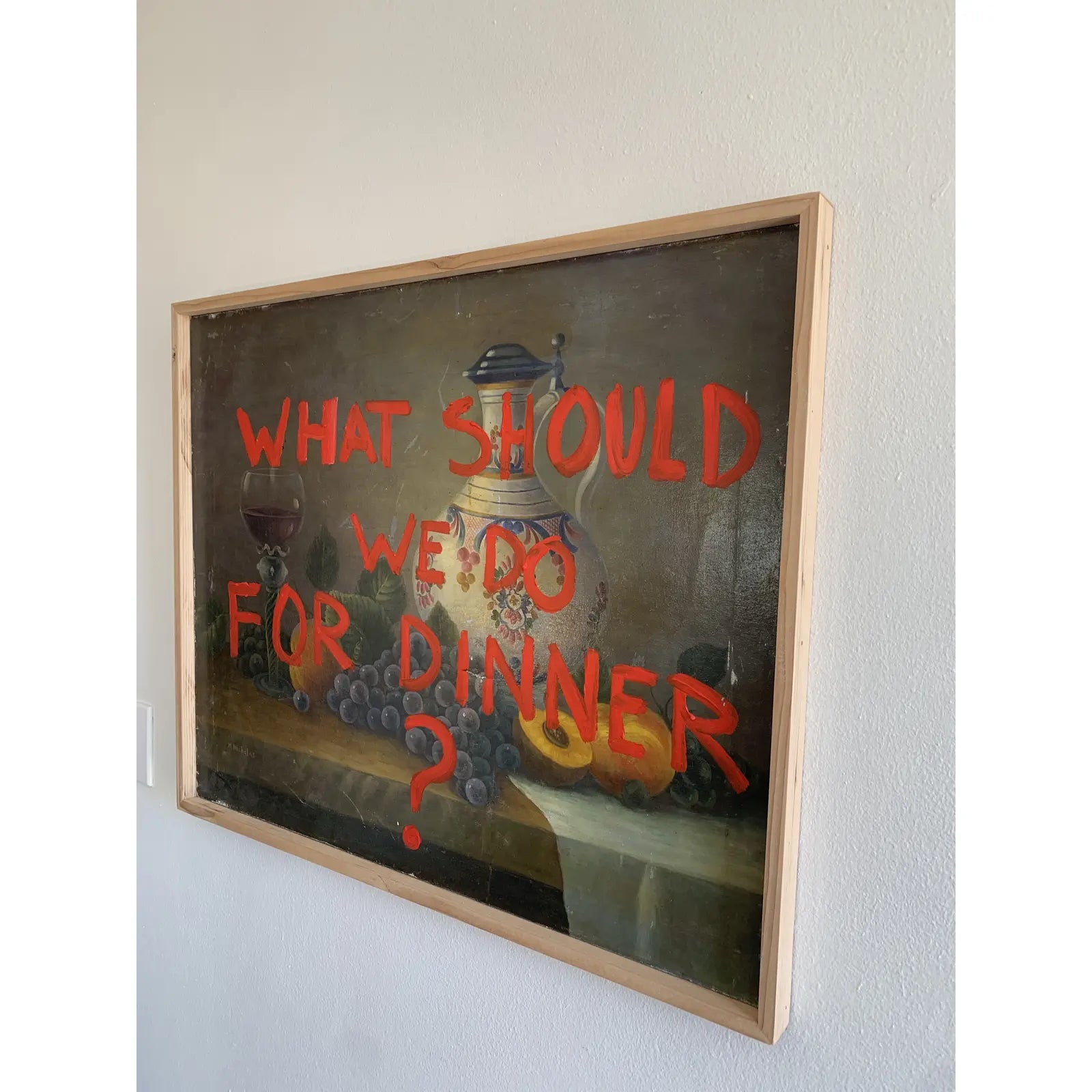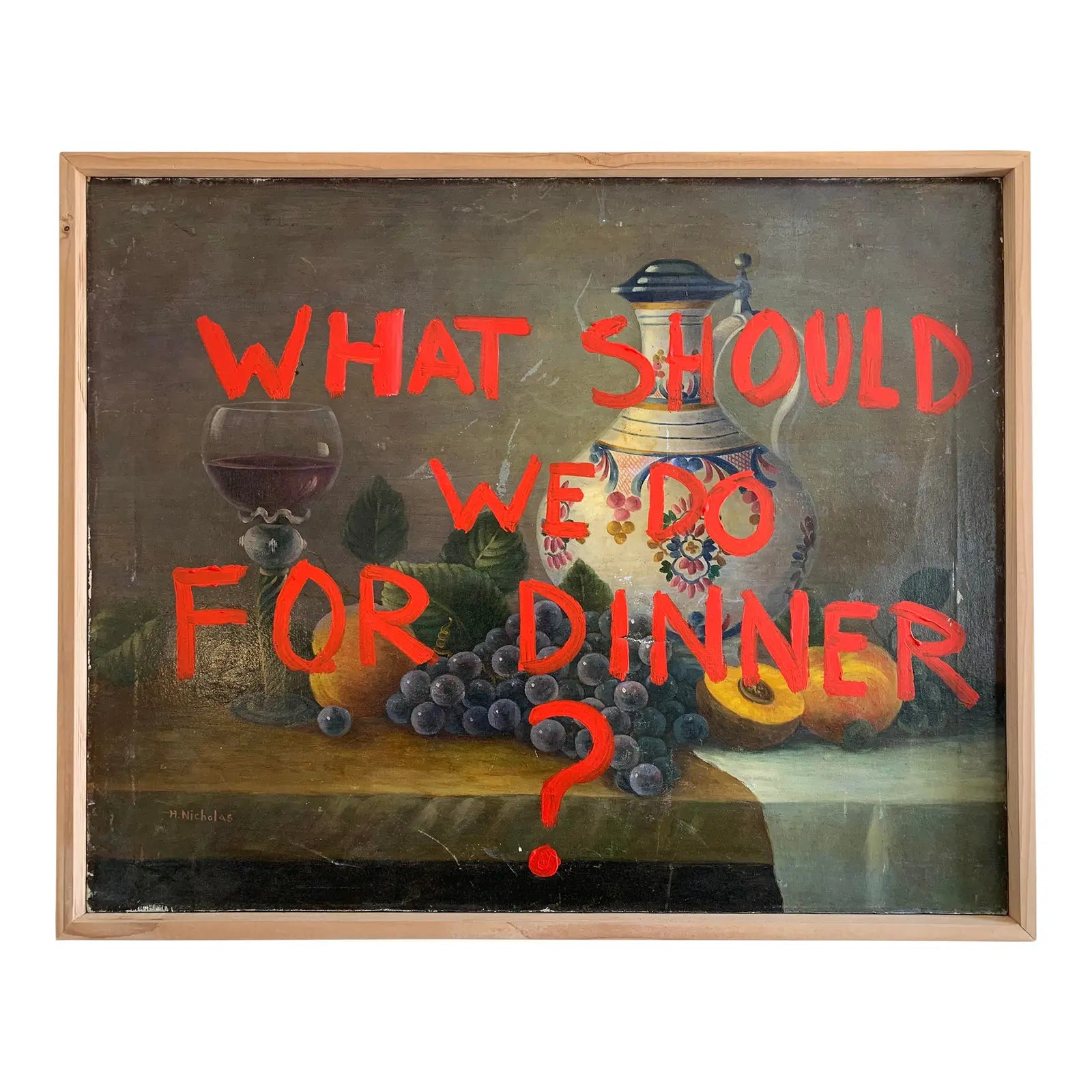One of life's pressing questions, What should we do for dinner? This piece features a found early 20th century oil painting of a still life table scape and was edited with bold red lettering. Framed in a simple wood frame.